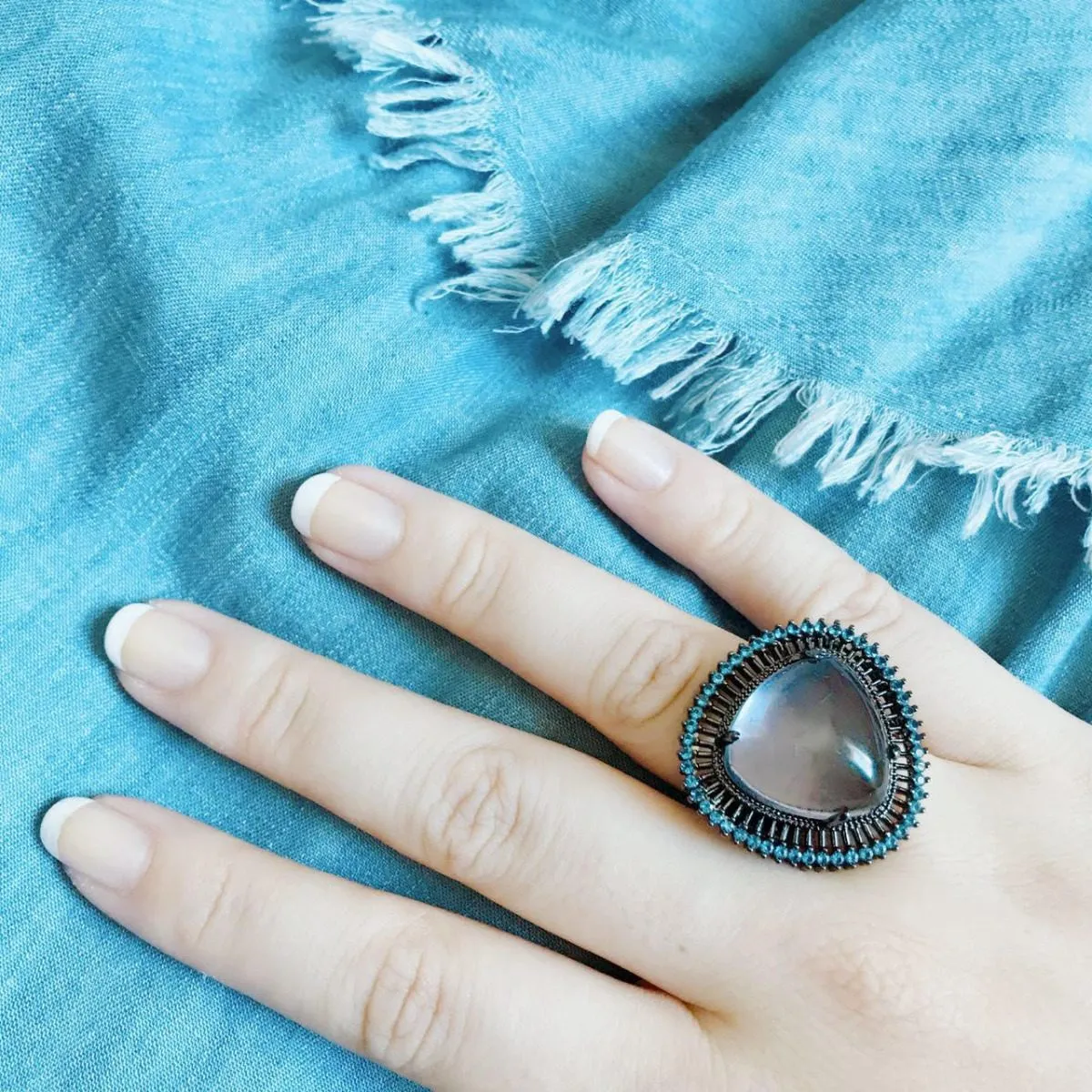 Anel com Zircônias Azuis e Cabochão – Folheado a Ródio Negro